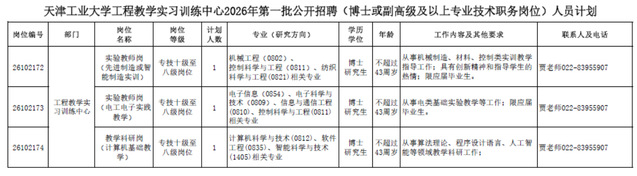 公开招聘方案相关信息于2026年1月23日在天津市教育委员会网站(https://jy.tj.gov.cn)招聘信息专栏和天津工业大学官方网站(https://www.tiangong.edu.cn)公开招聘专栏发布。具体招聘岗位见《天津工业大学2026年第一批公开招聘(博士或副高级及以上专业技术职务岗位)人员计划》(特别说明:此处仅列出天津工业大学工程教学实习训练中心公开招聘人员计划,全部人员计划详见天津工业大学官方网站)。